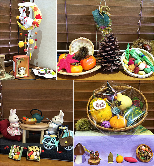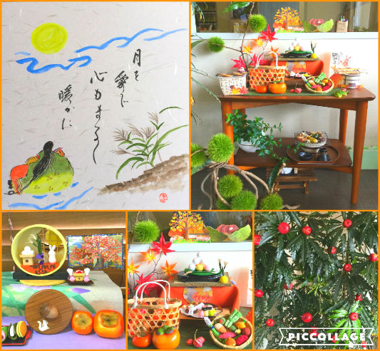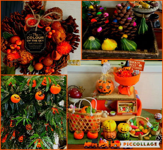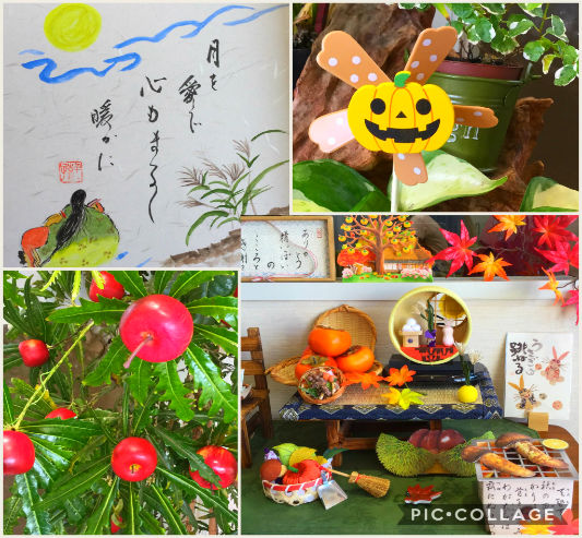 今の季節にぴったりな松ぼっくり、栗、ハロウィンなどの秋らしい飾りつけをしています(・∀・)